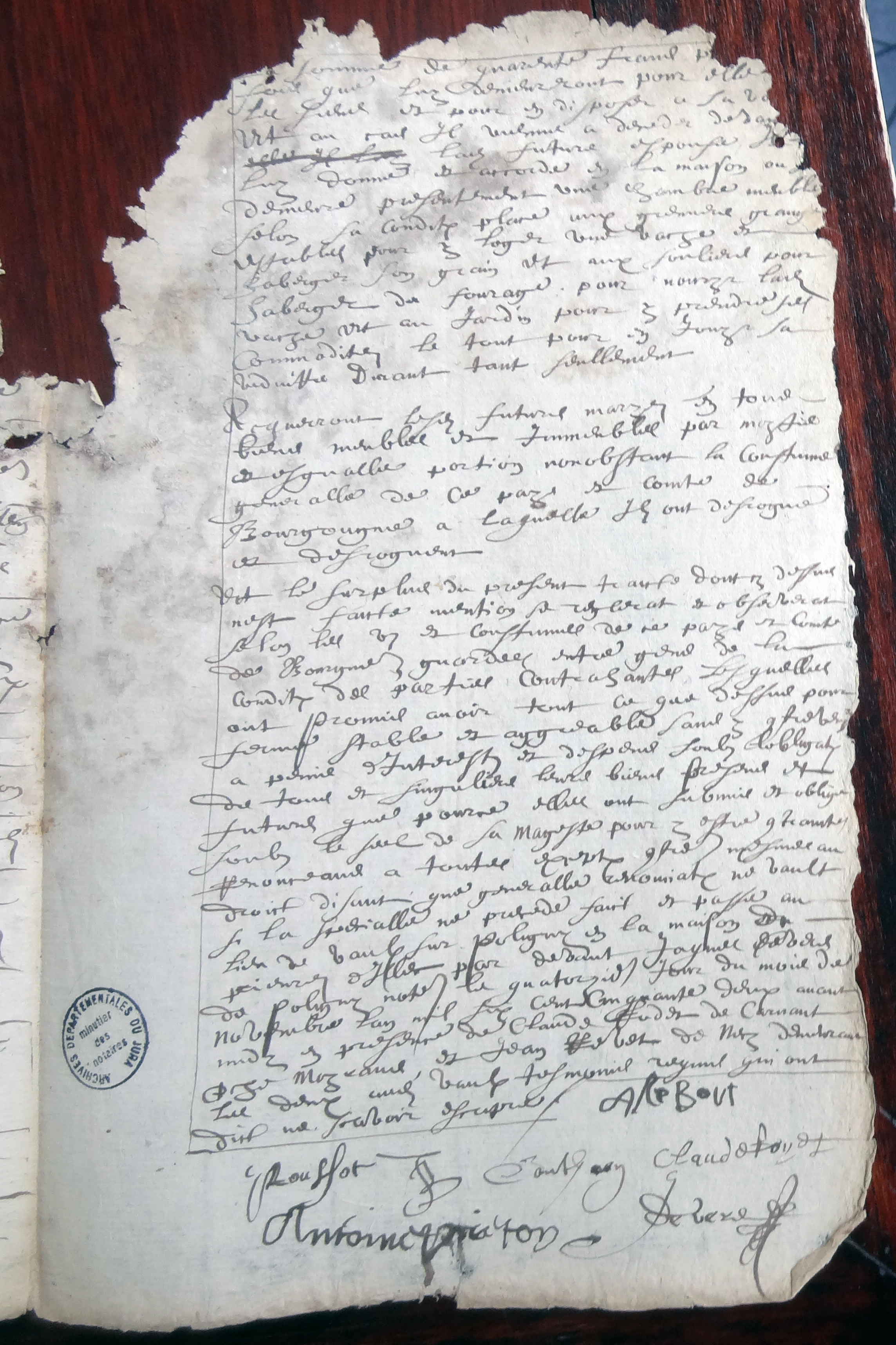 Il s'agit d'un acte rédigé par Me Jacques DEVERS, notaire à Poligny de 1633 à 1660. Source : Archives Départementales du Jura - Cote 4E 202.