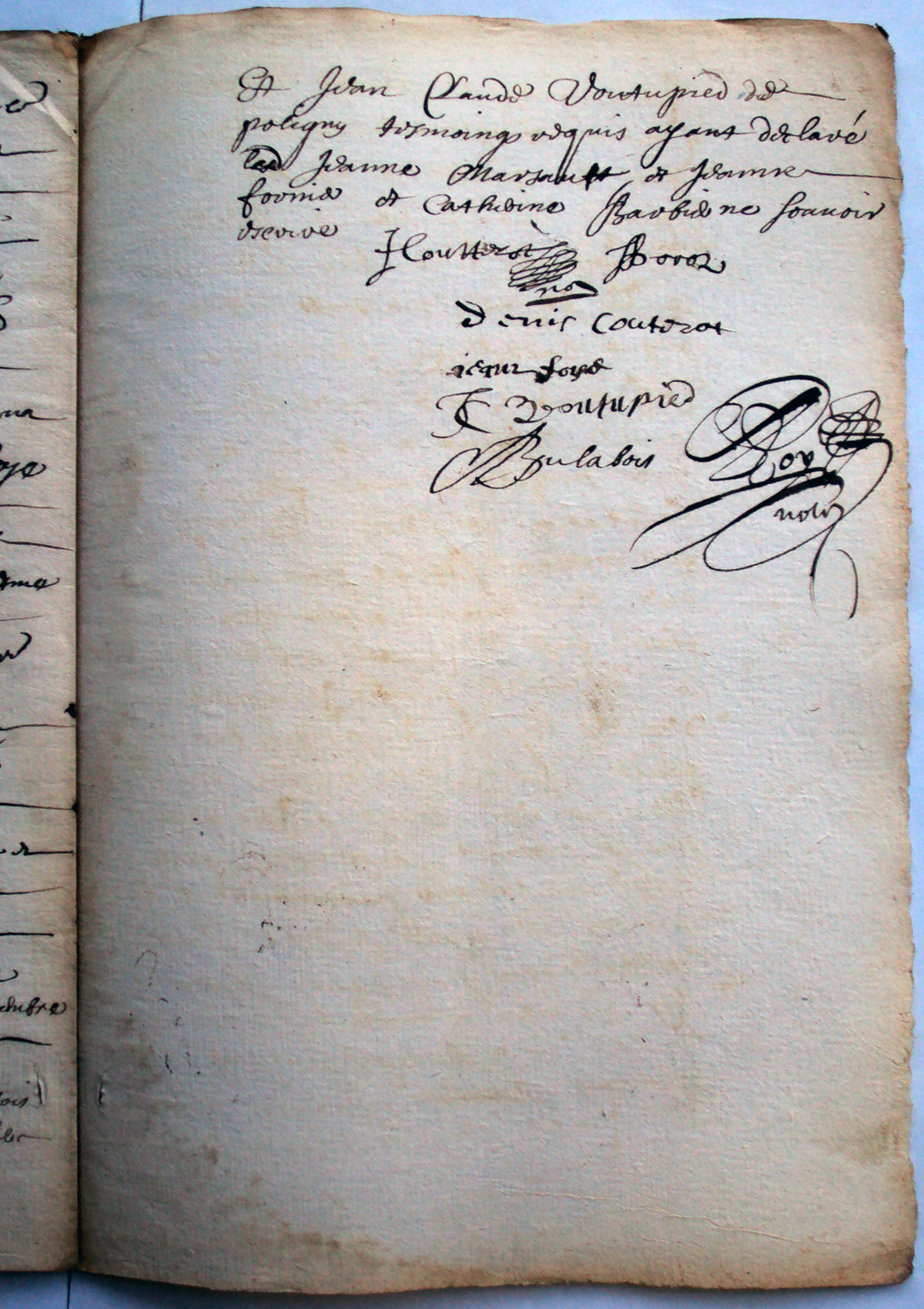Autres personnes citées dans l'acte : Denis COUTTEROT - Jeanne FOURNIER - Hugues BARBIER - Jeanne MARSAULT - Claude COURTOIS - Anatoille DOROZ - Jean FOYET FRIGOLE - Philibert FOYET FRIGOLE - Jean COUTTEROT - Denise COUTTEROT - Clauda BARBIER - Jeanne BARBIER - Jeanne Barbe BARBIER - Antoine BULABOIS - Jean Claude VOUTUPIED - Antoine ROY, notaire.