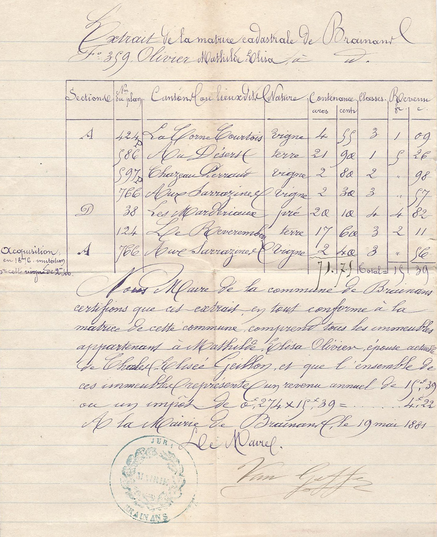 Extrait de matrice cadastrale établie en 1881 à la mairie de Brainans